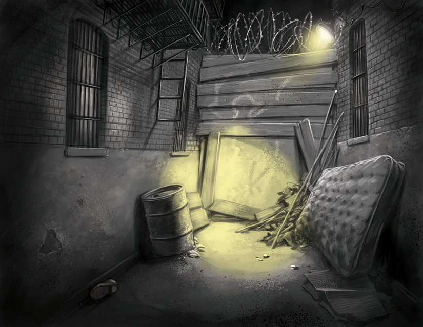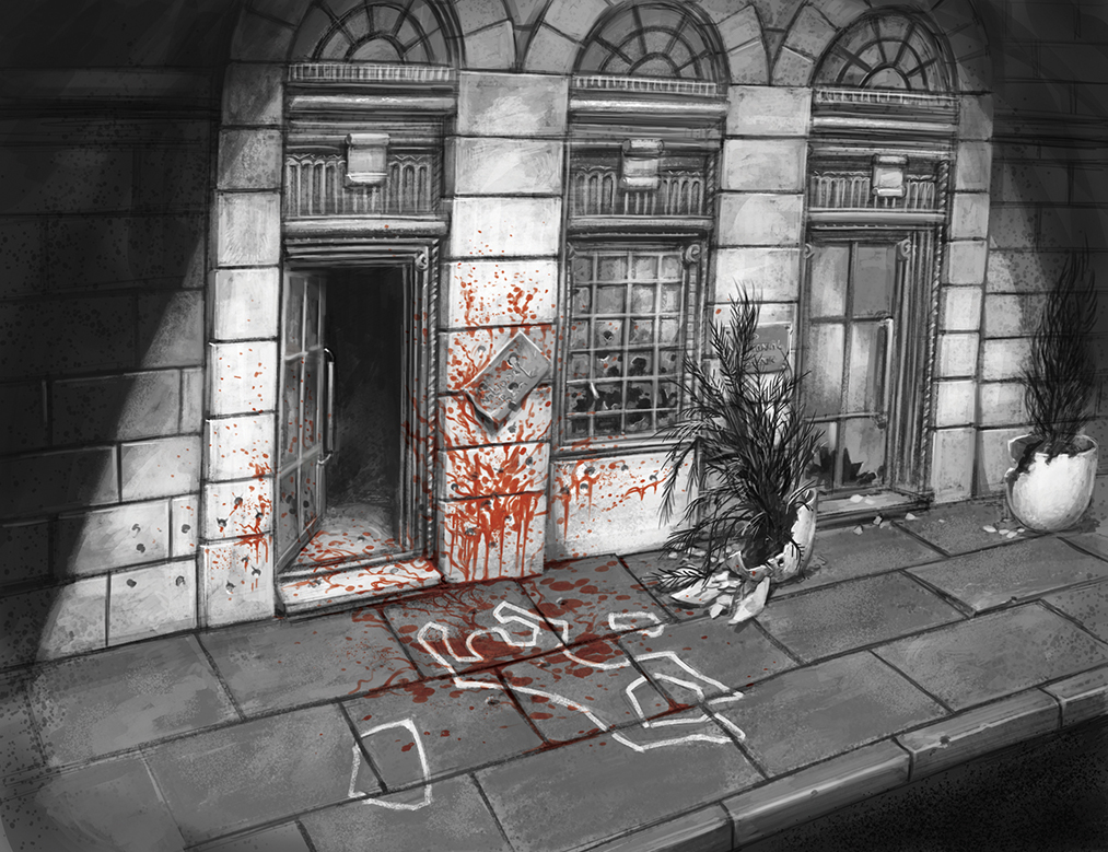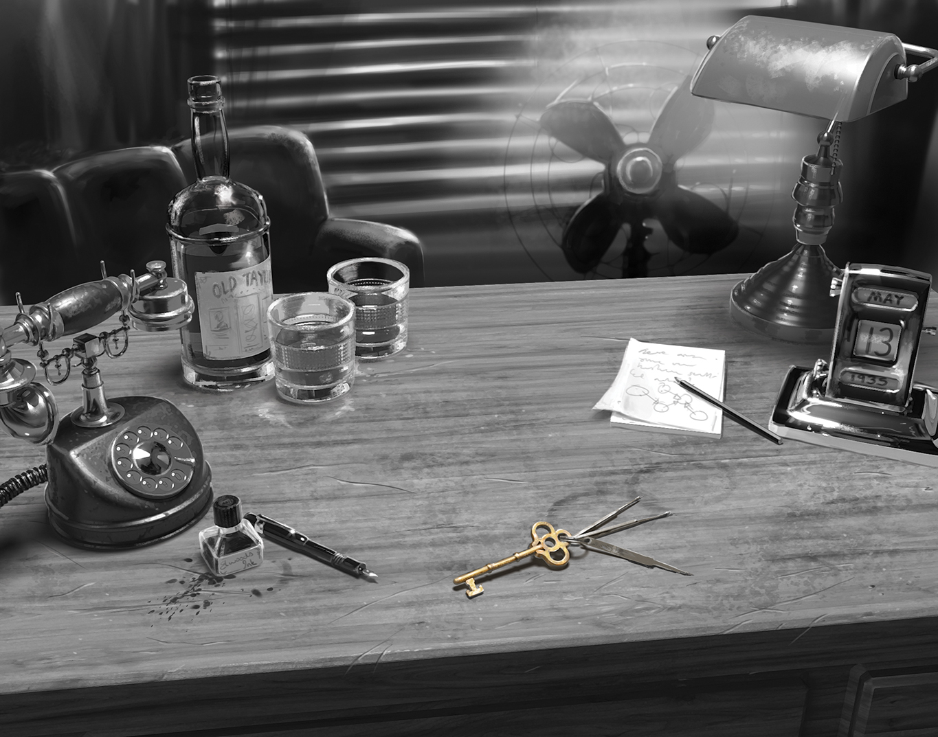 The idea is that all images are black and white, noir-style (heavy shadows, etc), but with one key colour in each case