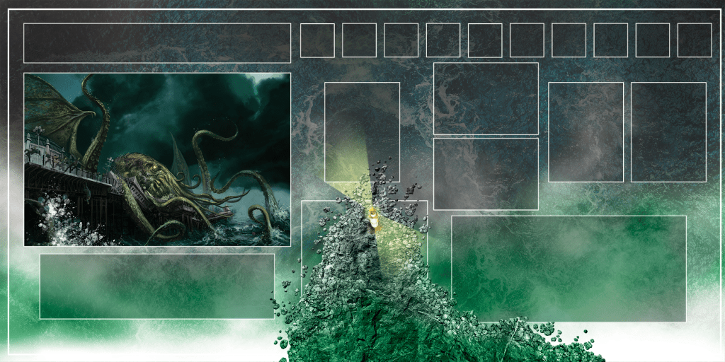 This board sits above the main board, and holds various cards, trackers, etc. And look! There’s that image again. 🙂 Most of the artwork is covered, so this is from a stage used to ensure the boards align correctly. This one was just created in Photoshop as there was less of a need for 3D layouts.