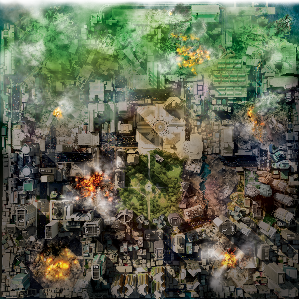 The city can be destroyed as the game progresses, so areas of destruction had to be factored in to the design. Once the location card is removed, Hey-Presto. Insta-crater!