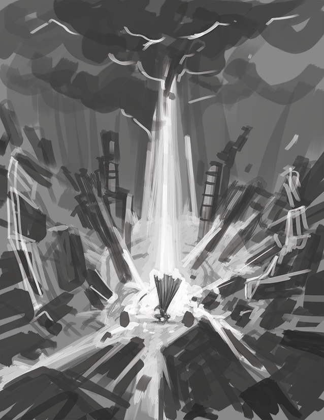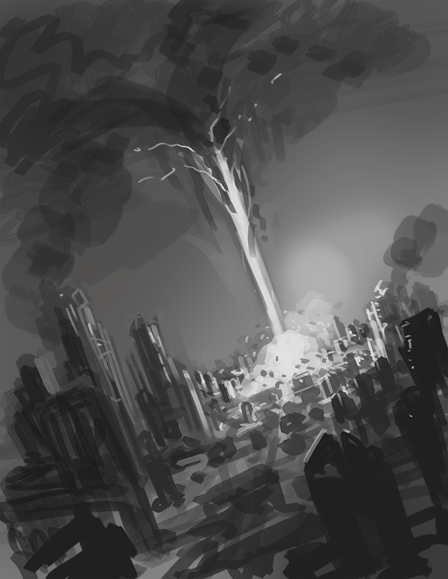This was initially blocked out in 3DS Max and rendered using V-Ray, but it quickly became apparent that that particular approach was only going tio get me so far, so the majority of work was produced as paintover in Photoshop. The 3D layout was useful to achieve our initial layout, e.g. where should the POV sit (we ended up central, but the initial approach was to place the camera near the bottom of the board), which lens angle is best to convey the sense of height without coverng up too much street detail, what sort of scale should we work at, etc…?