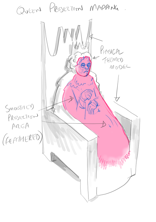 An exception was the final, throne room scene which was revised after the team had disbanded. I redid all elements of this scene including animation, 3D and even some sound effects. The physical model that the queen is projected onto I created in Z-Brush to be created by CNC machine for the ride.