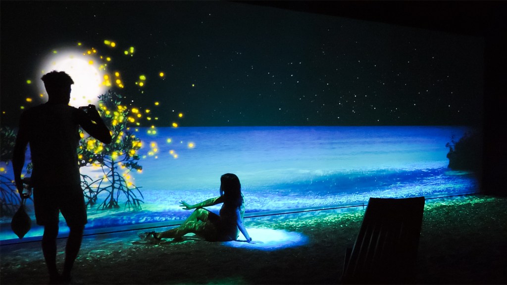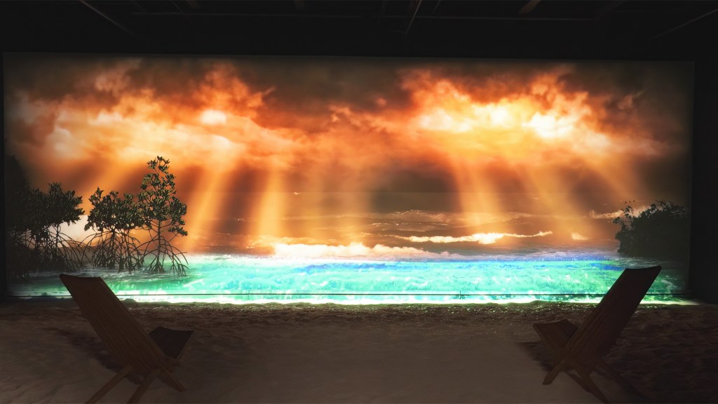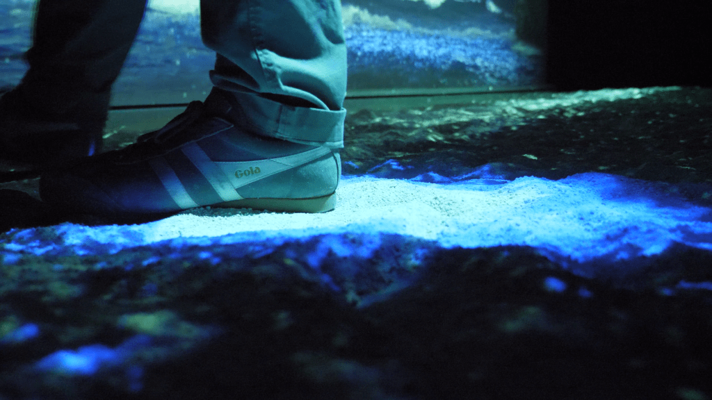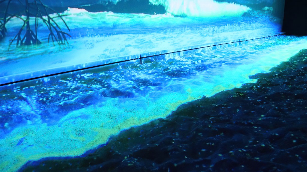 For the interactive piece, Mangrove Beach, I repurposed our existing Bio Beach exhibit with new video and audio content, and designed a new context for it, including real sand. The original Bio Beach was part of our Sydney development, which you can see here and, although I designed a large part of that piece, the original interactive was not mine.