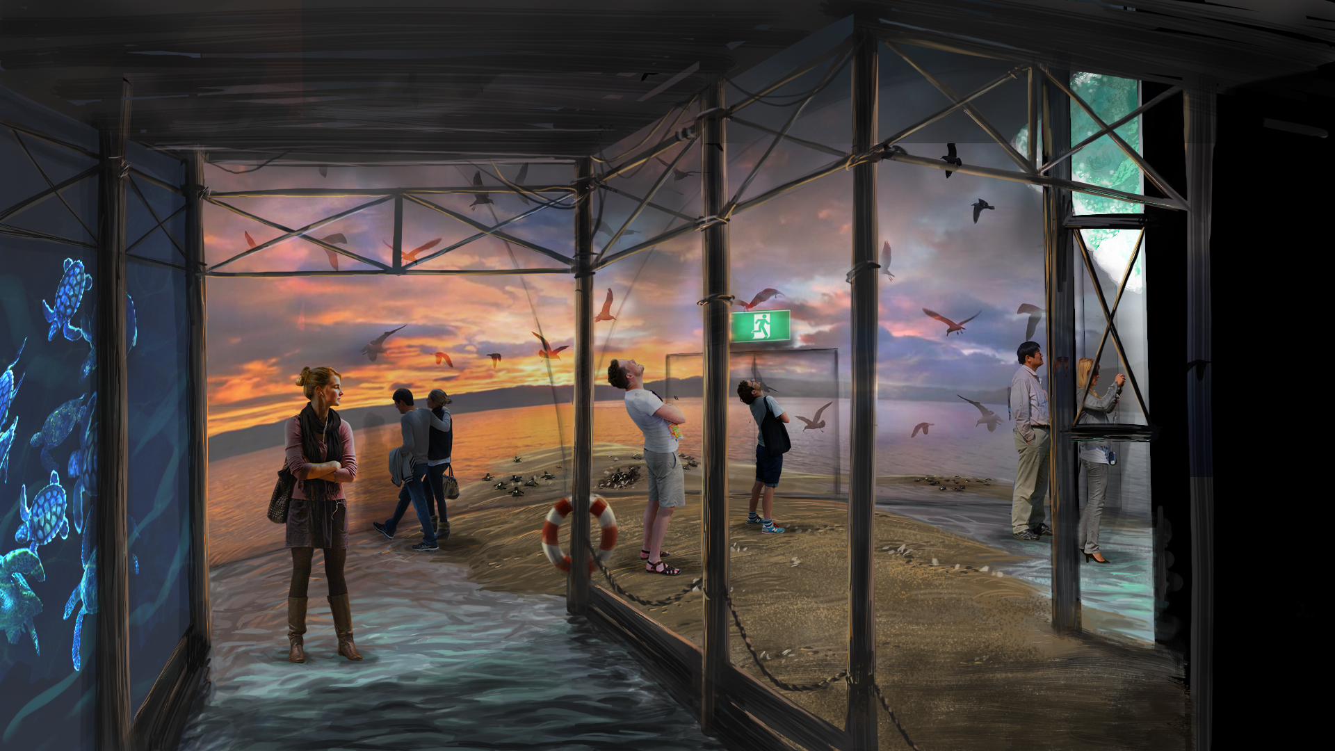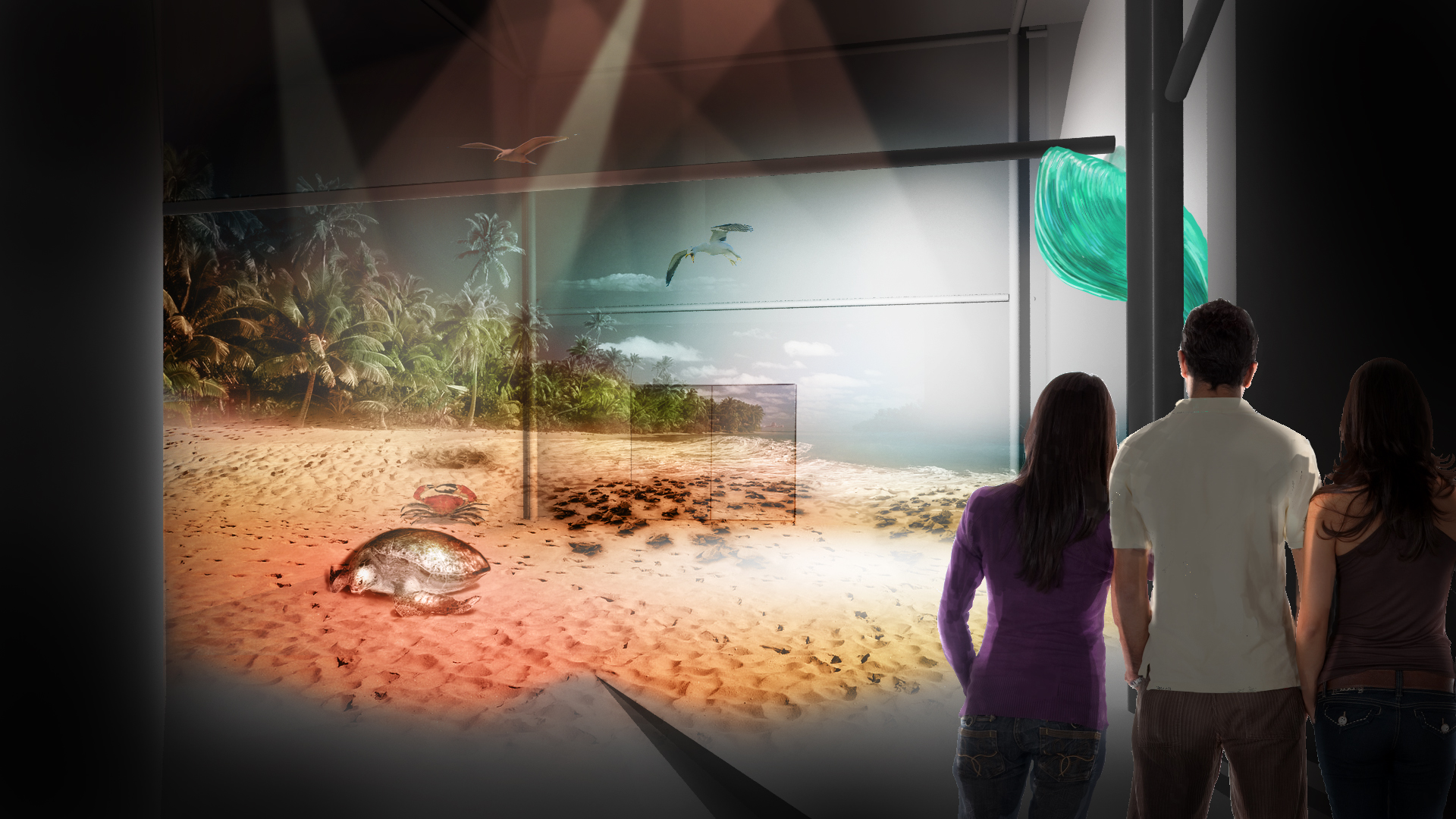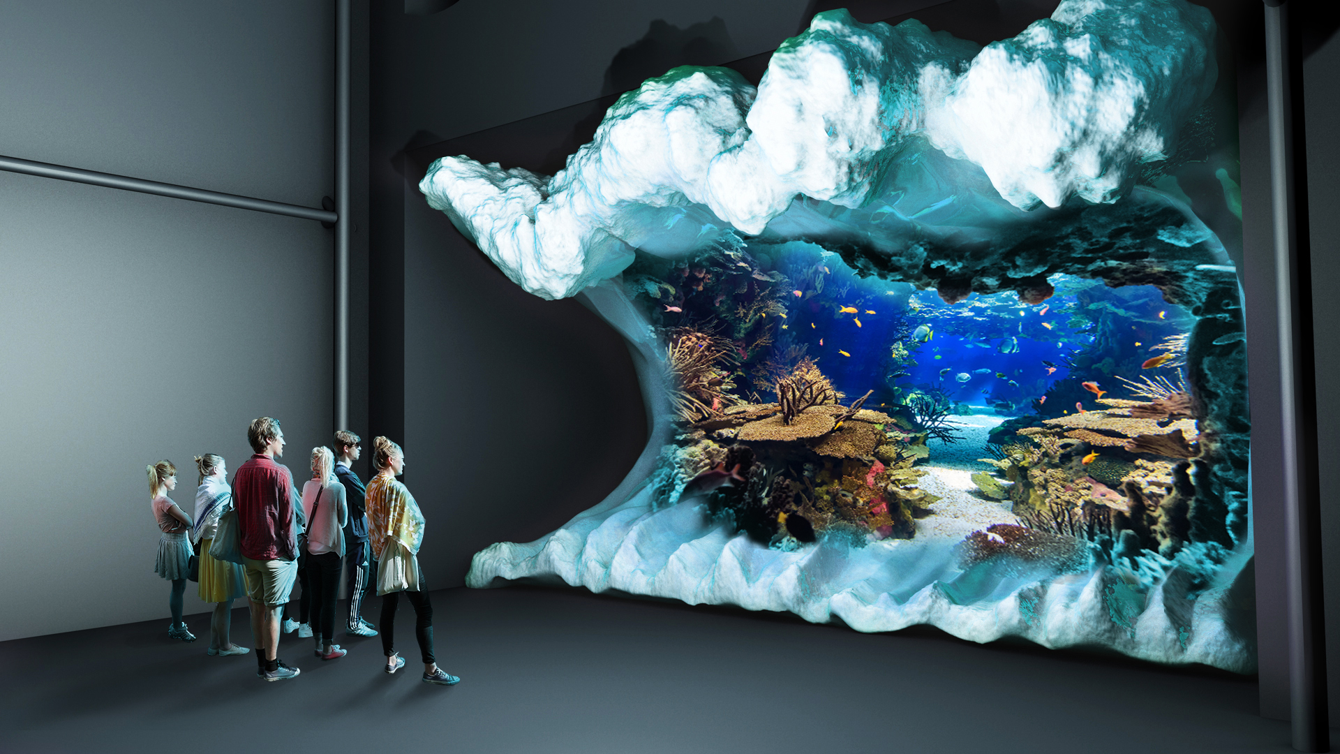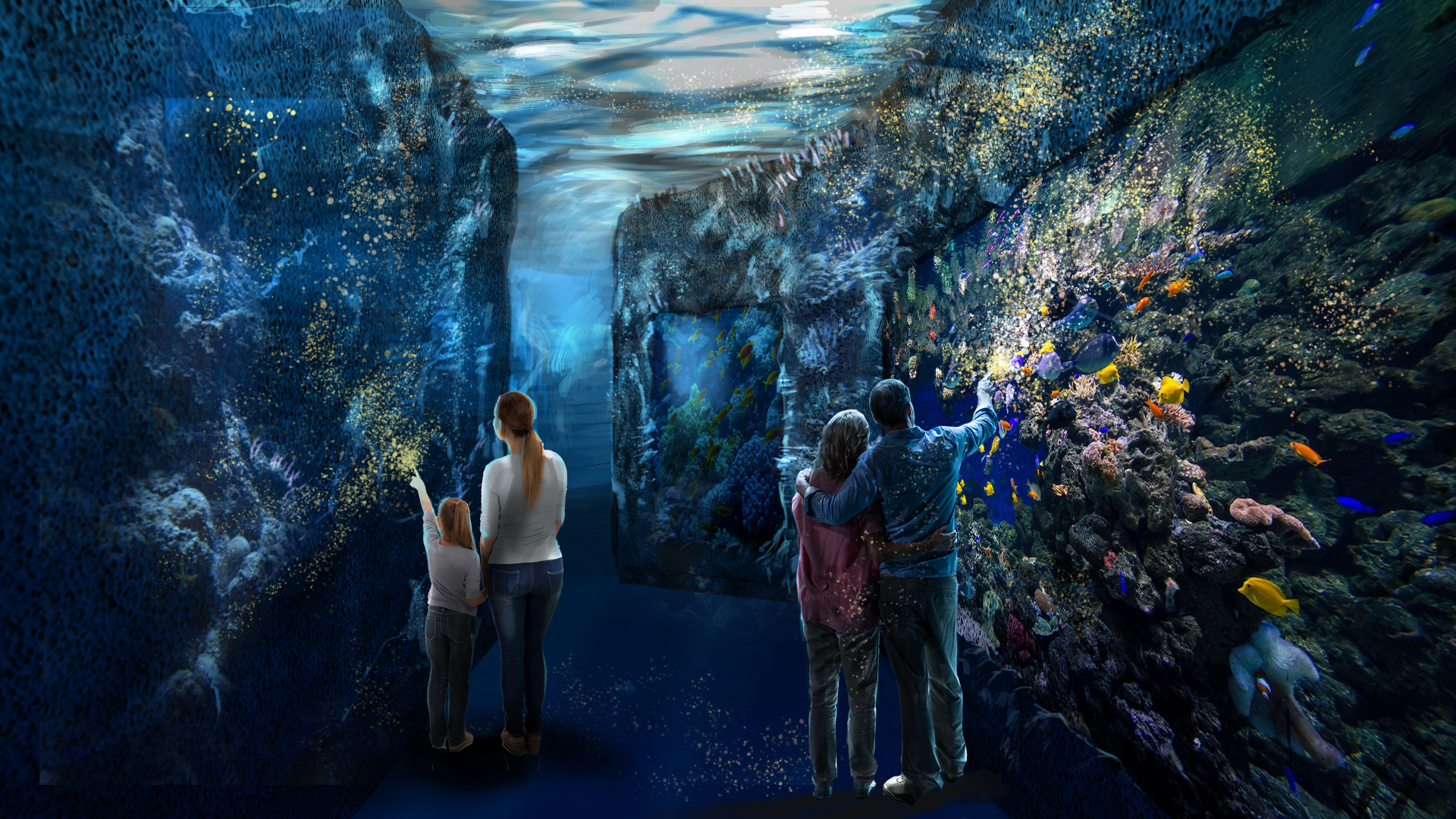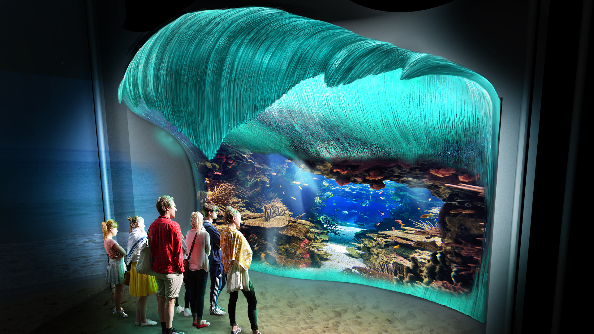 The second stage of our work was to design and produce the AV content, and it’s presentation. This was in a variety of ways, from a huge “standing wave” sculpture framing a view into the ocean tank, interactive particle systems showing coral spawning, a growing reef to an interactive, fully projection mapped finale show, illustrating the breeding cycle of a turtle.