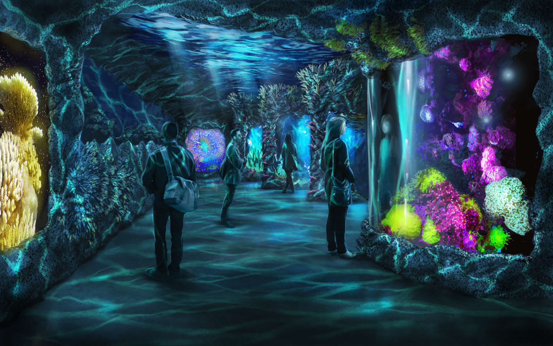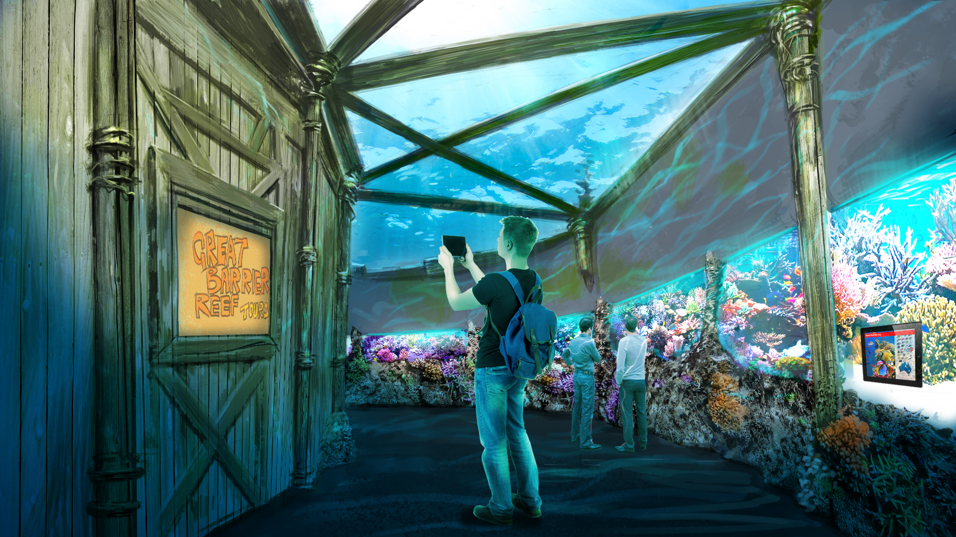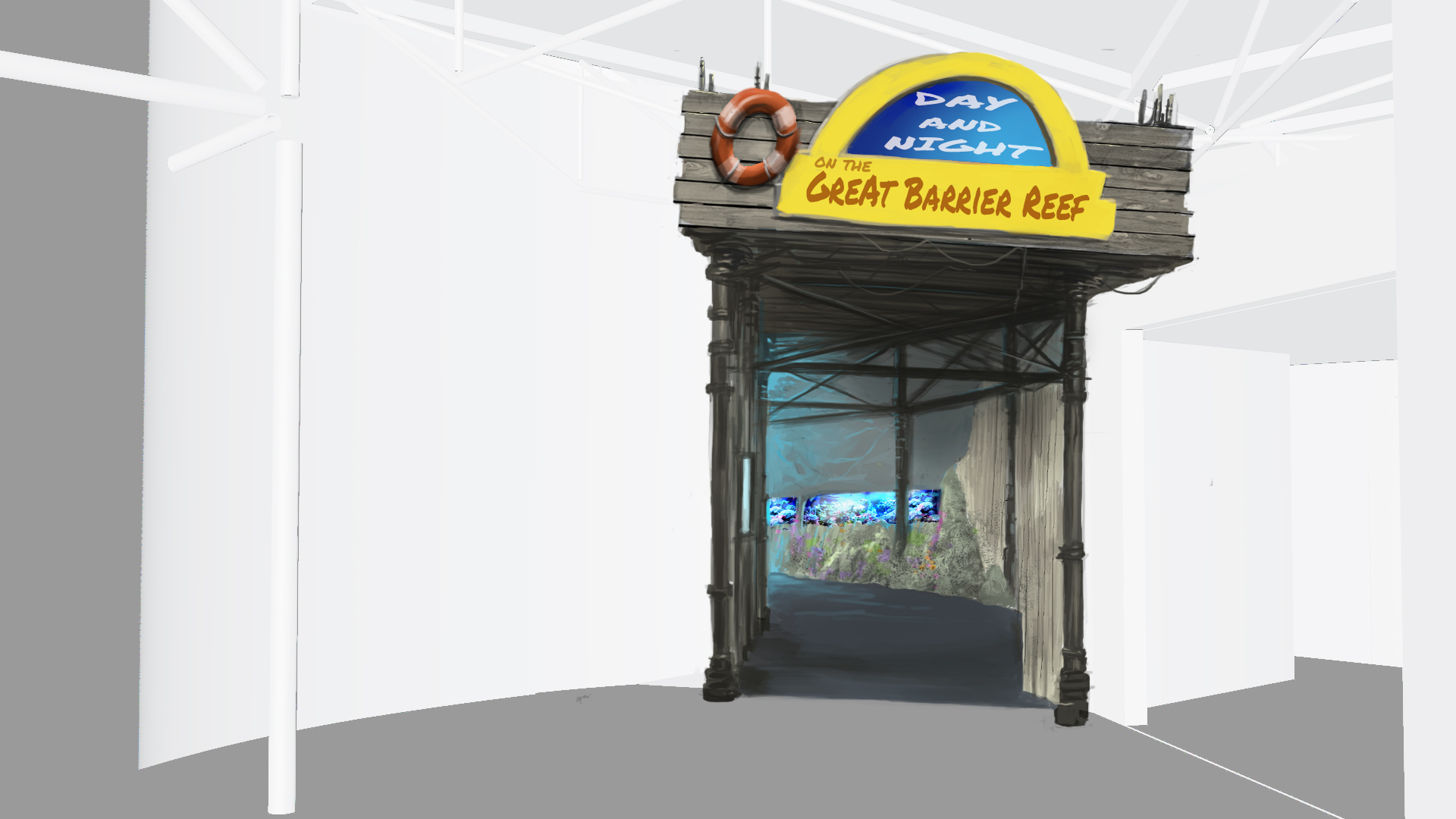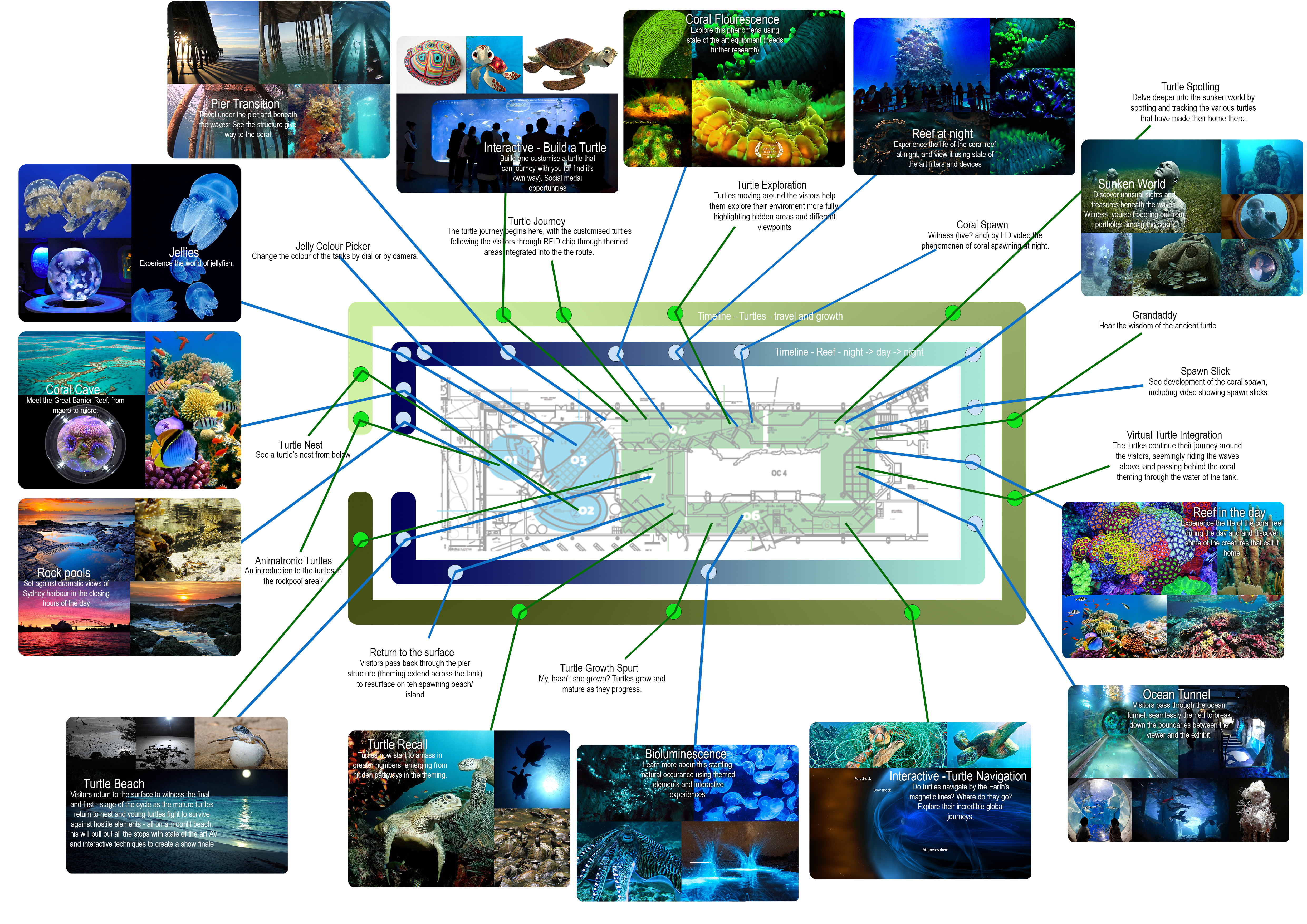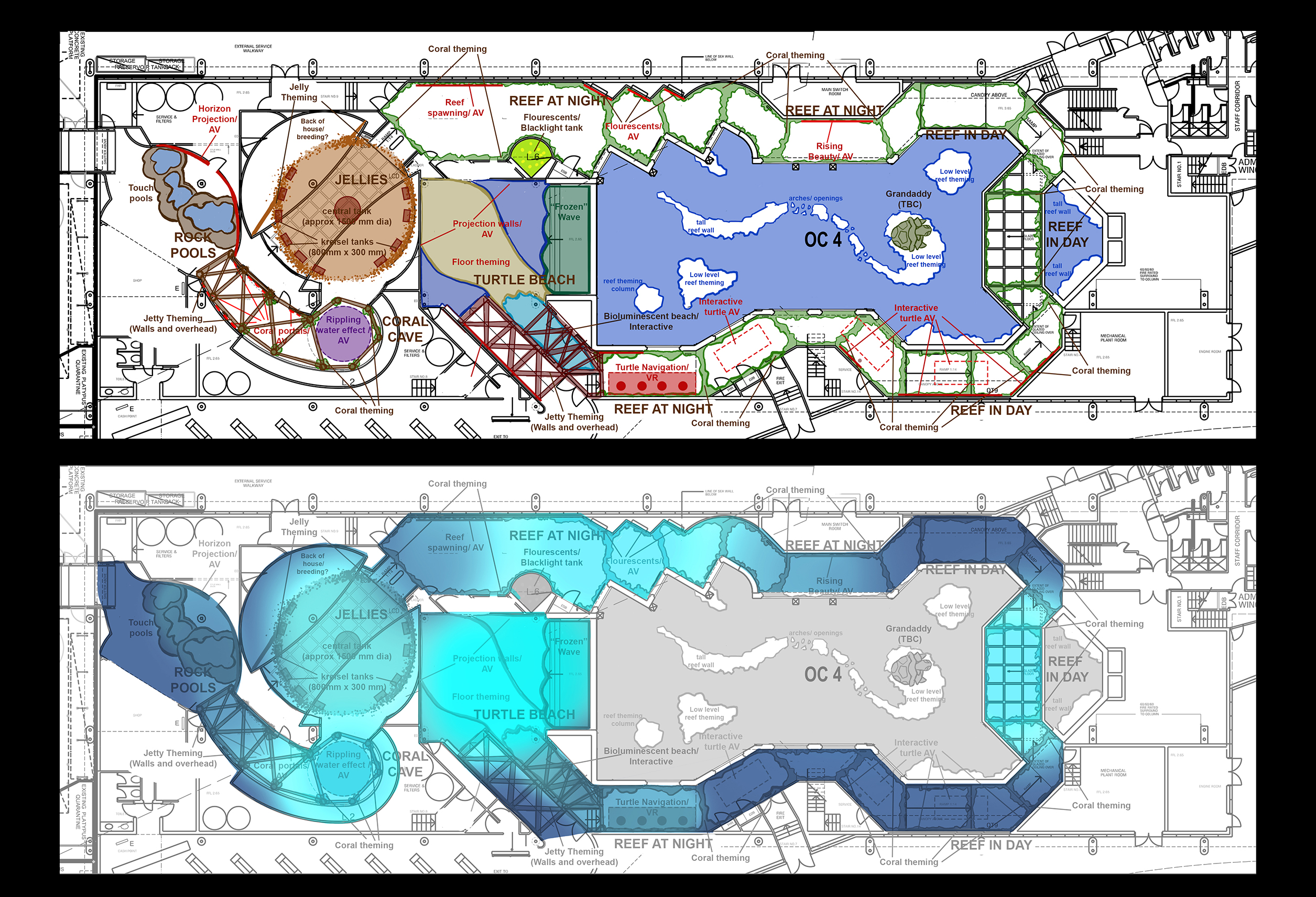 Our work on this project came in two stages; firstly the director, Evan Grant, and myself designed and plotted the entire experience for Day and Night on the Reef, and then created to attraction’s themebook.
