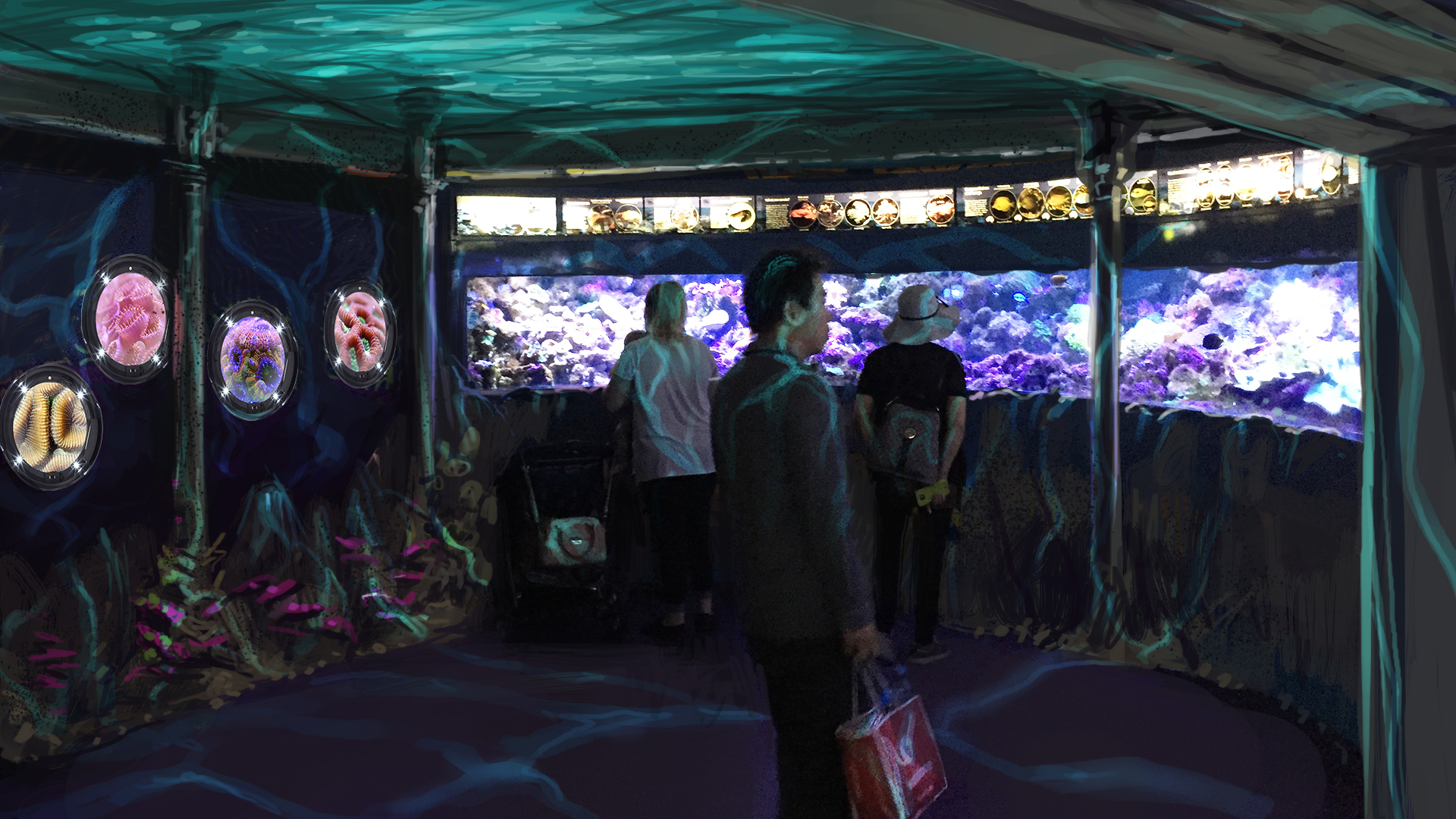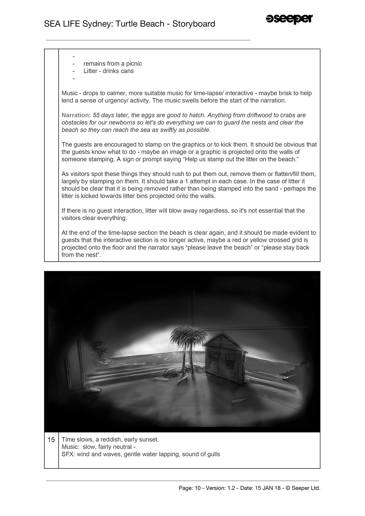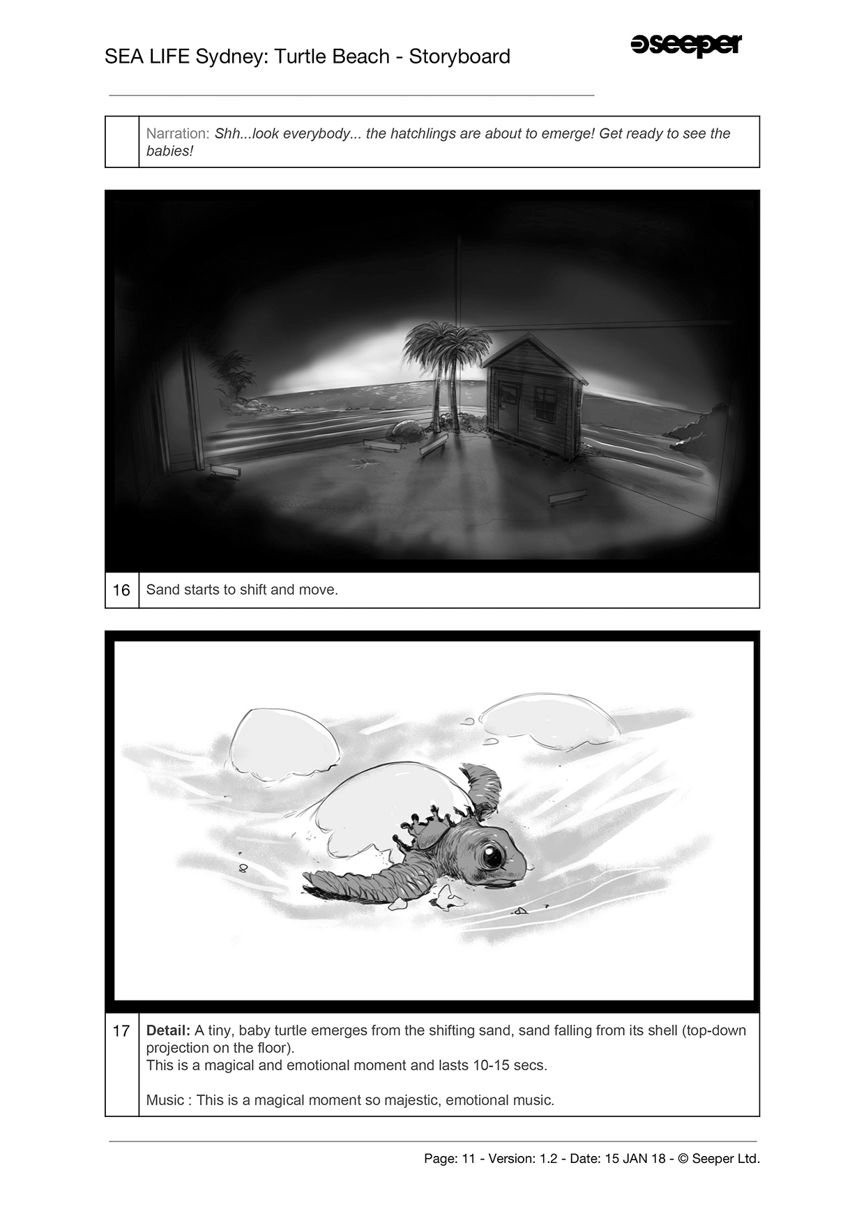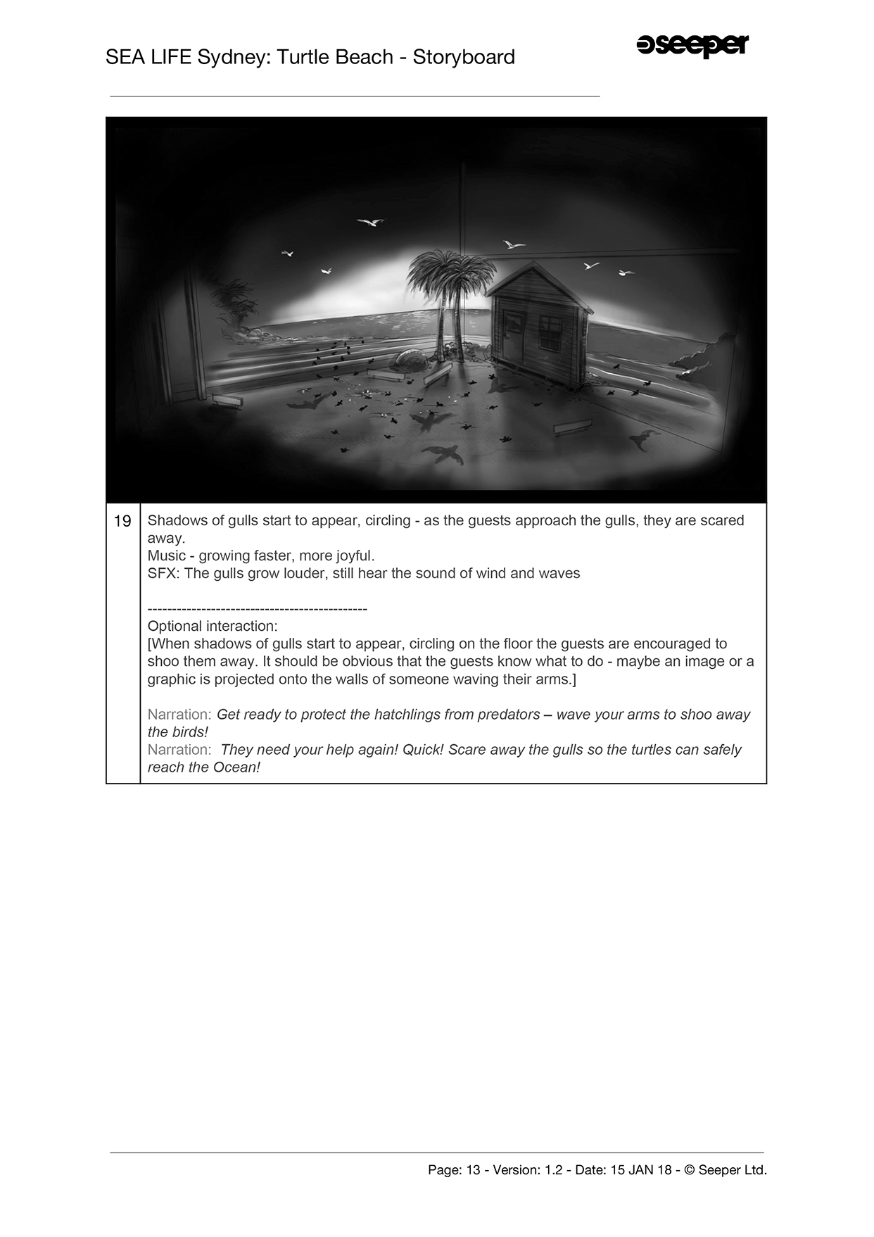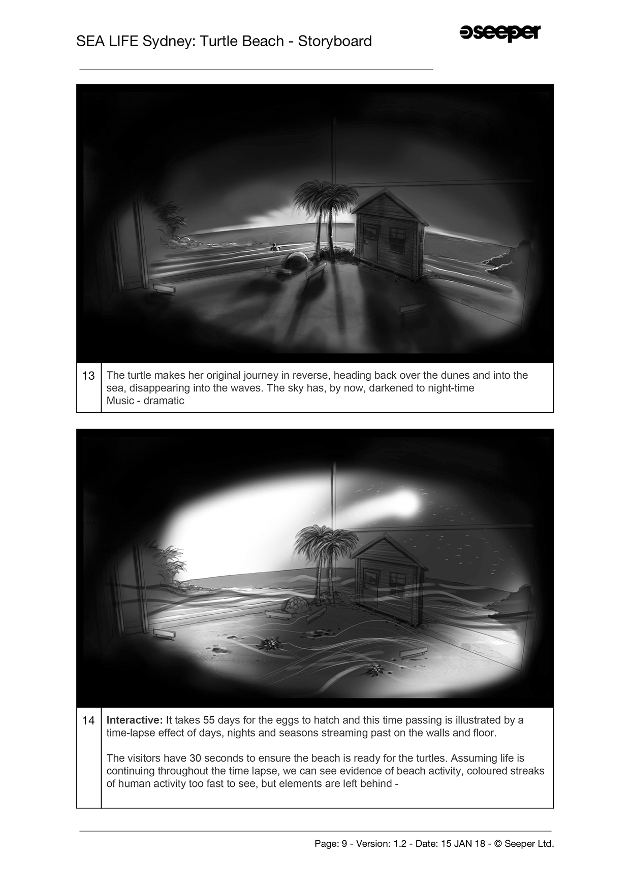 Our work on this project came in two stages; firstly the director, Evan Grant, and myself designed and plotted the entire experience for Day and Night on the Reef, and then created to attraction’s themebook.