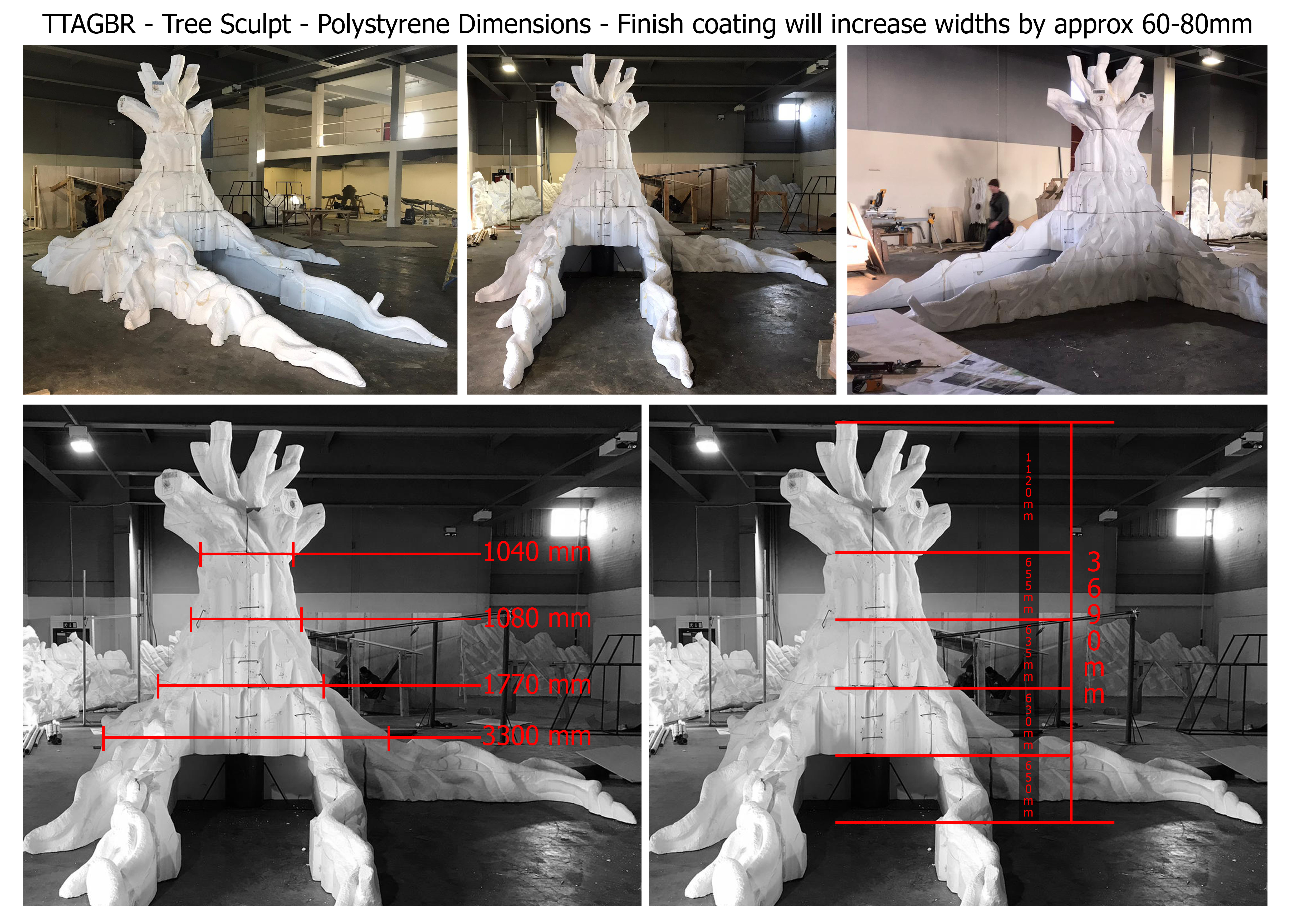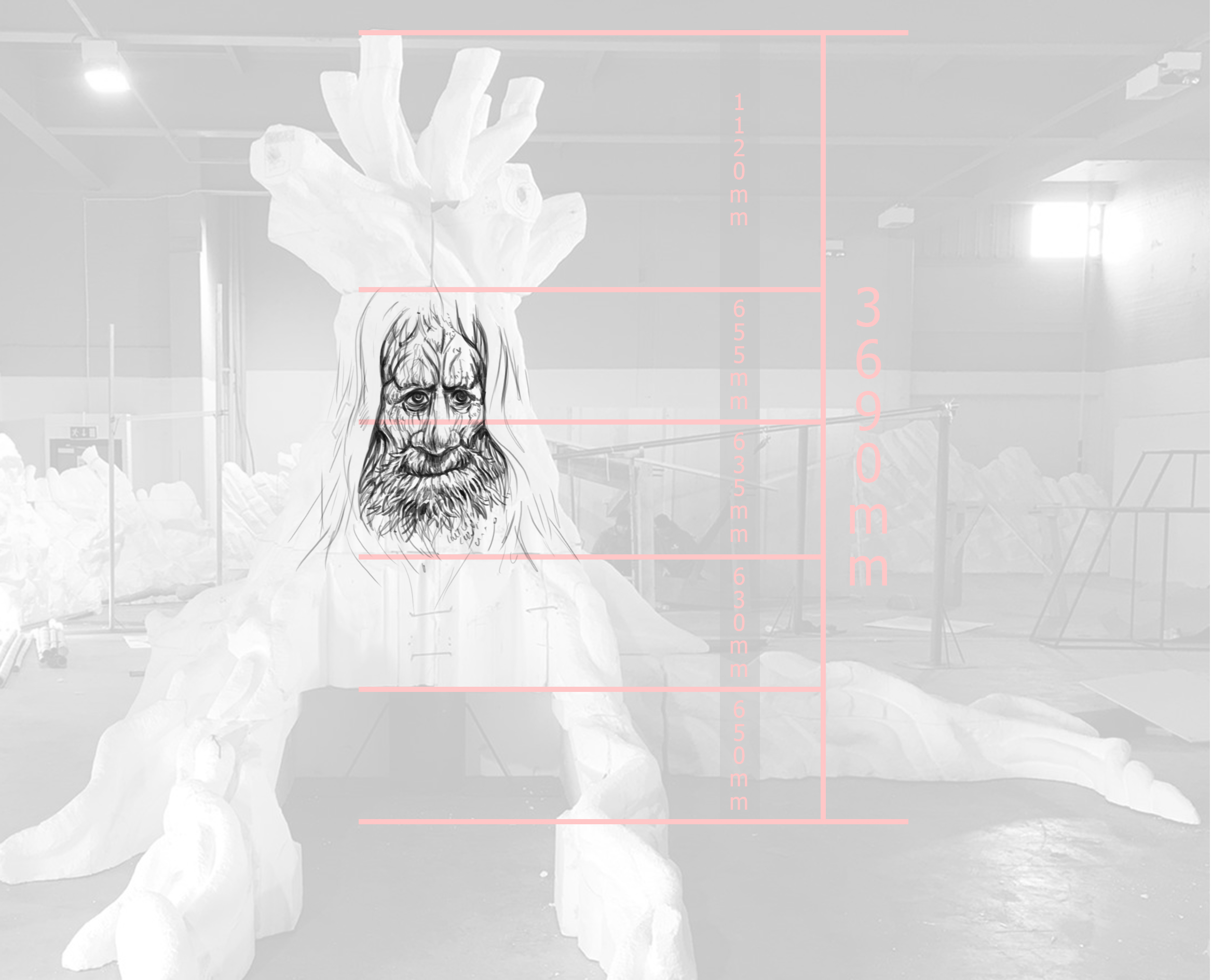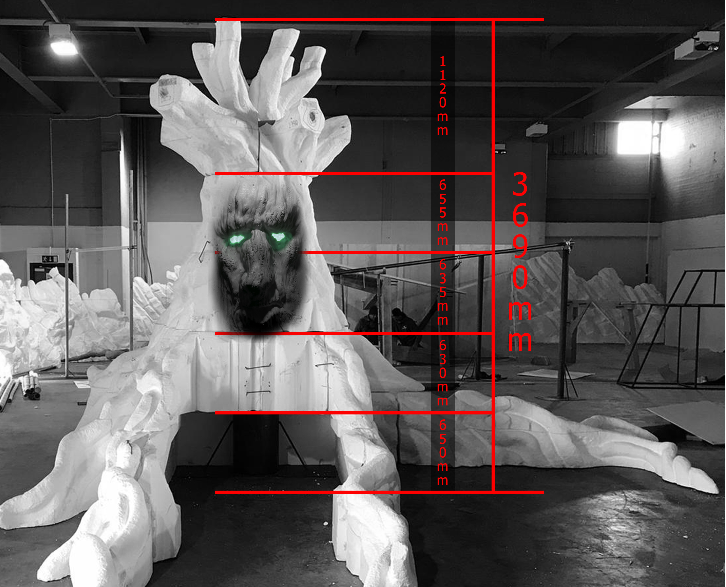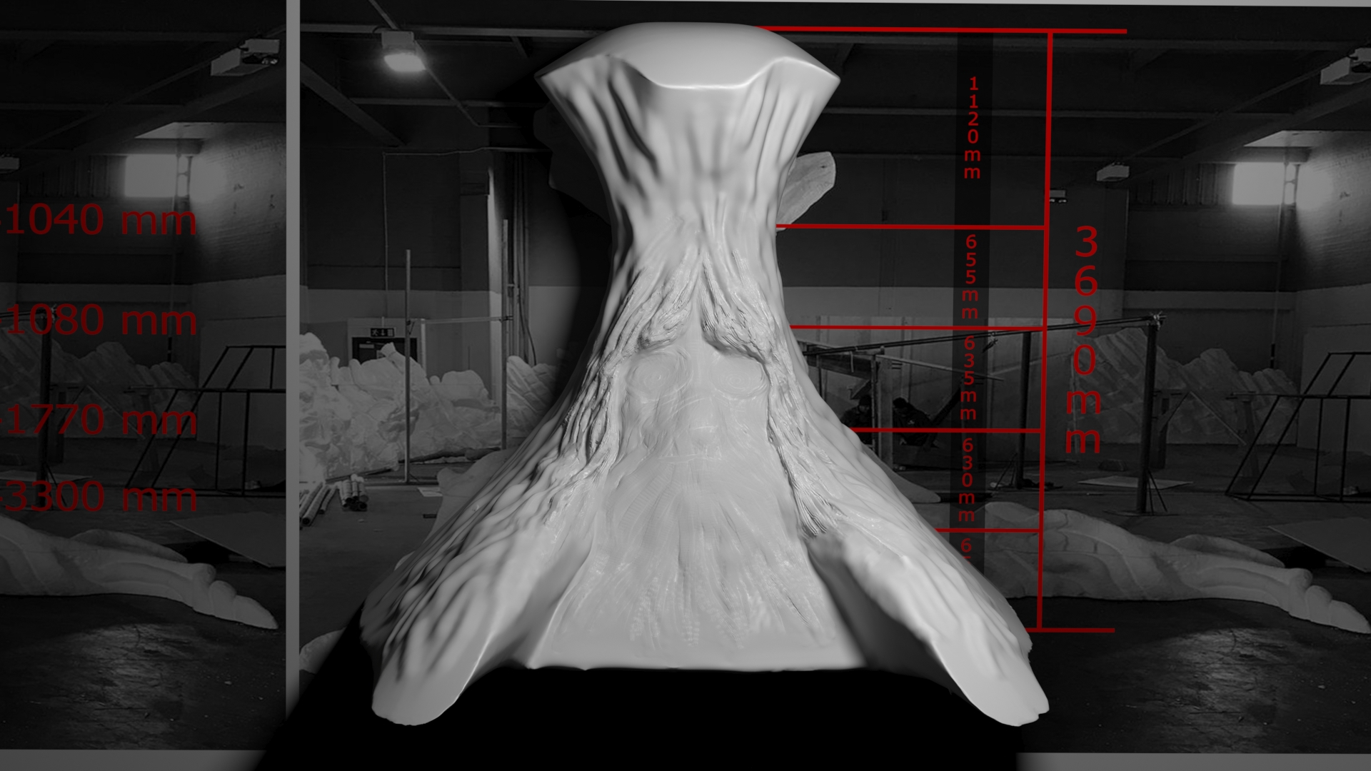 The tree itself was captured and digitised, and used to create a base model and face sculpt. The face was to “grow” out of the base tree, but needed an appropriate space for the projecte image to sit on. That model was sent back to the sceen builders to ensure the physical model could be modified to work with the content.