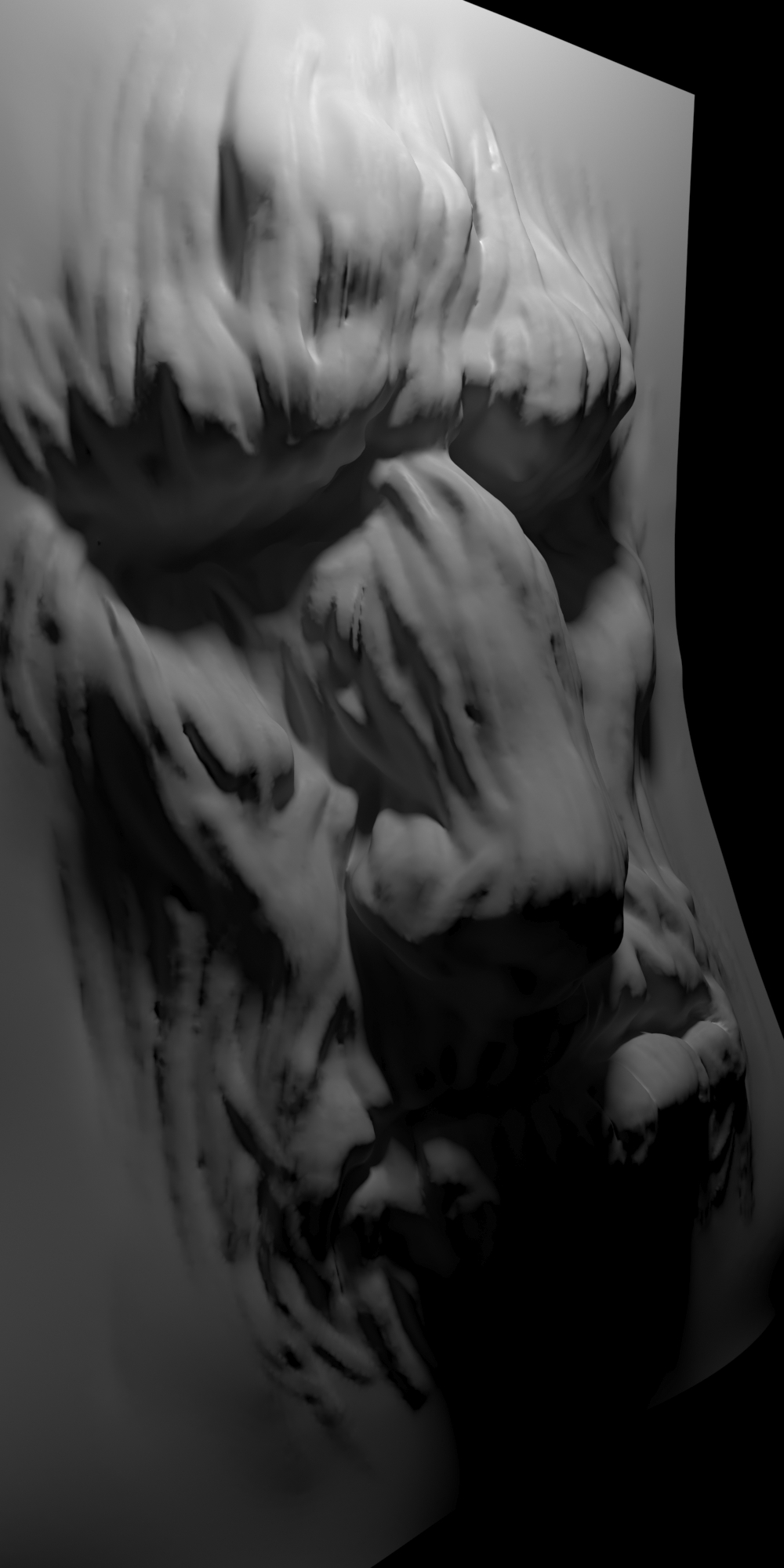 The workflow involved ZBrush to create the facial shape blend targets, 3DS Max to create the shape-blend animation, rendered in Corona, and Adobe After-Effects to comp the whole thing and add the particle trail VFX and lighting.